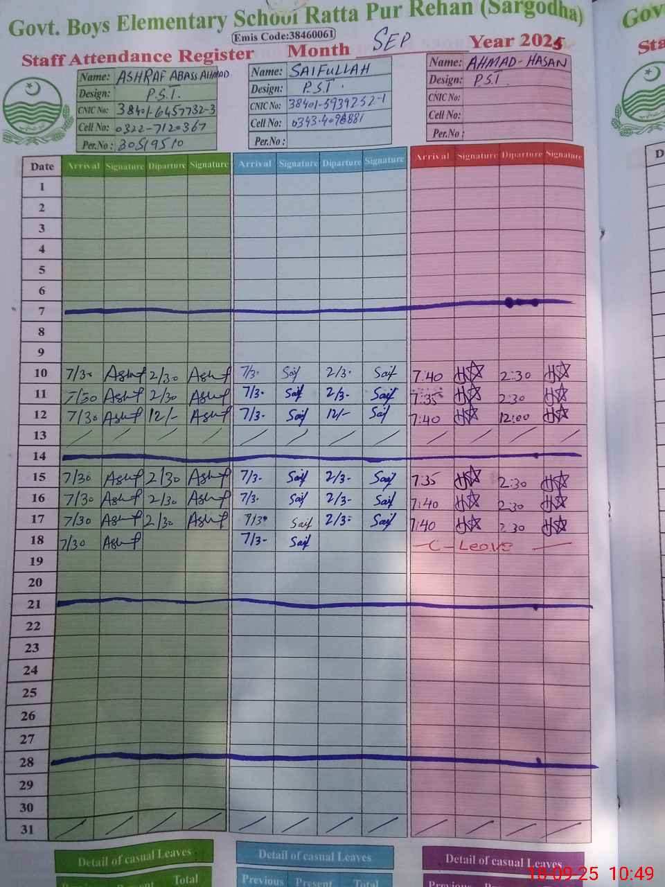 | CNIC | Full Name | Designation | R/C | Absence during last cal. month |