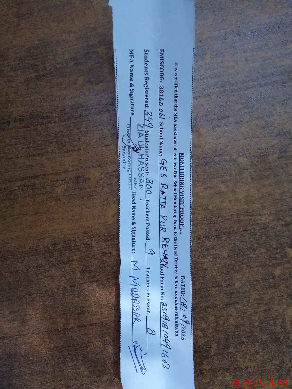 | Certified that this School was Inspected by the Undersigned MEA/DMO Today and the Information Stated Above is as Per Record. | |||||