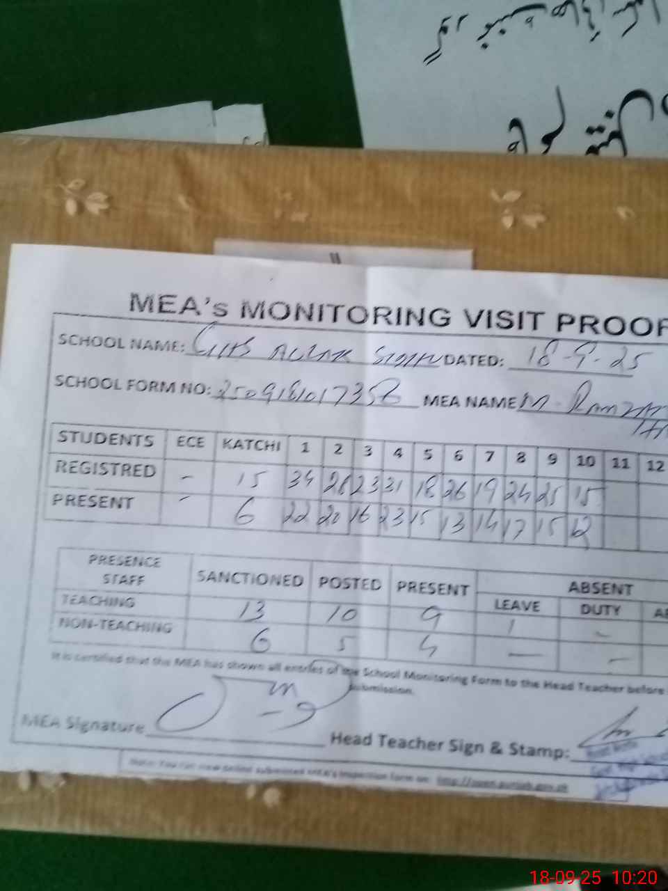 | Attendance Register | Head Teacher | MEA with School | Visit Proof |