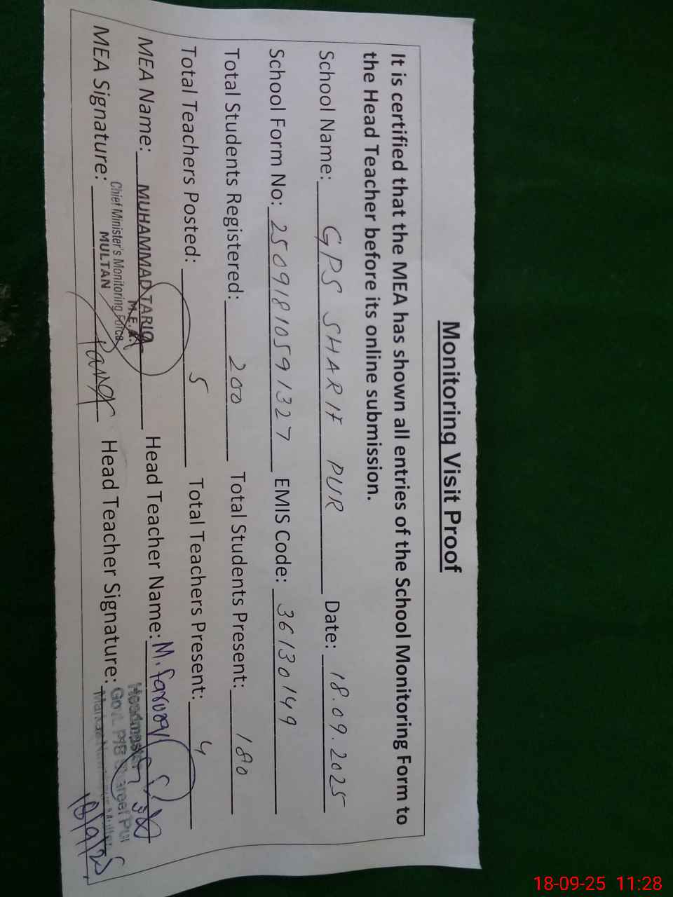 | EMIS Code: 36130149 | Name of School: GPS SHARIF PUR NAWAB PUR MULTAN | |||