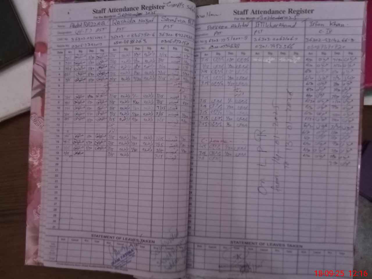 | CNIC | Full Name | Designation | R/C | Absence During Last Calender Month |