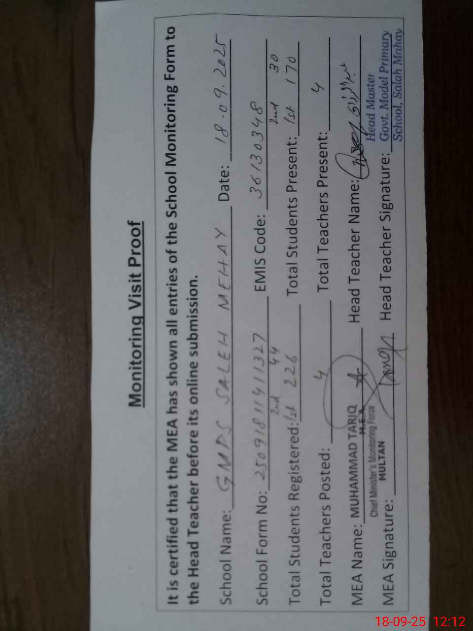 | Attendance Register | Head Teacher | MEA with School | Visit Proof |