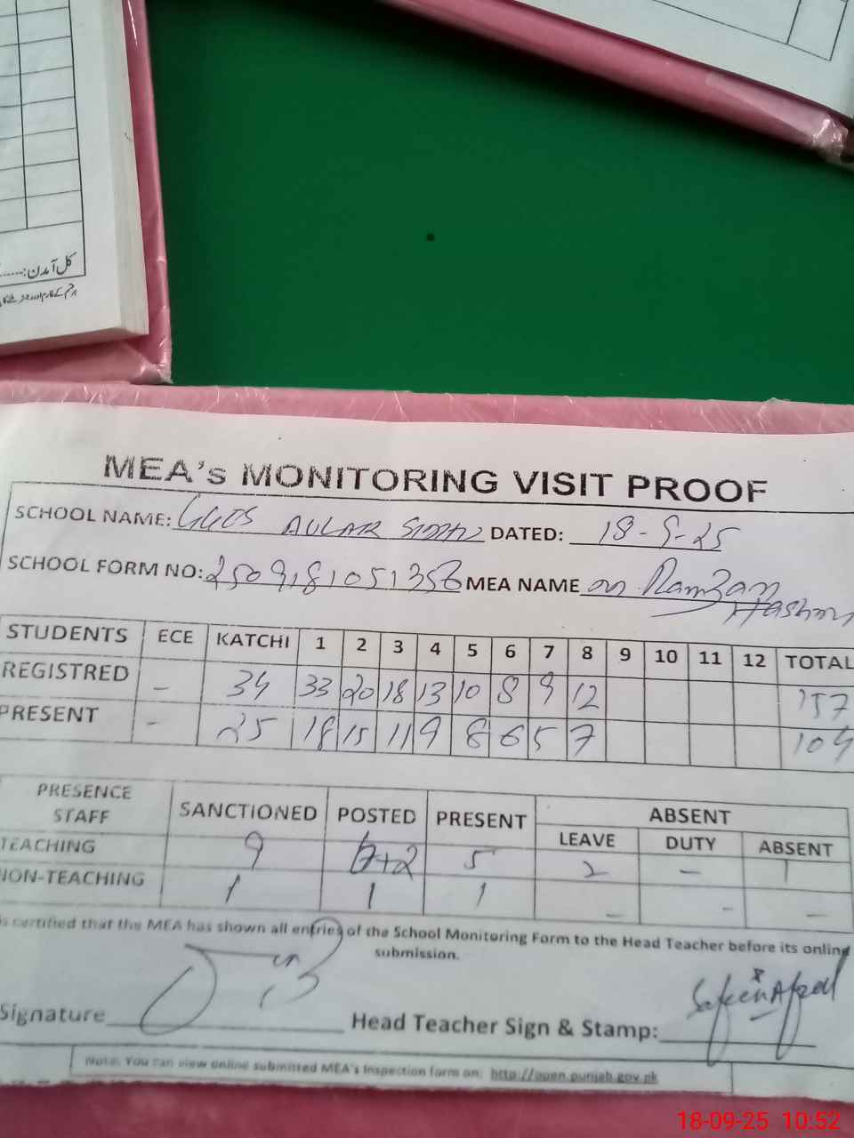 | Attendance Register | Head Teacher | MEA with School | Visit Proof |