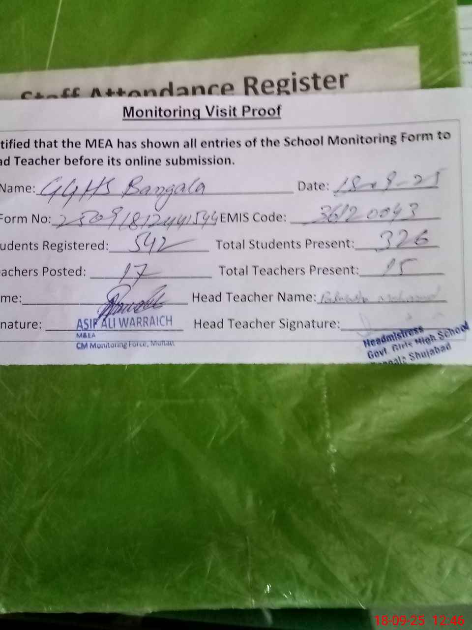 | Attendance Register | Head Teacher | MEA with School | Visit Proof |