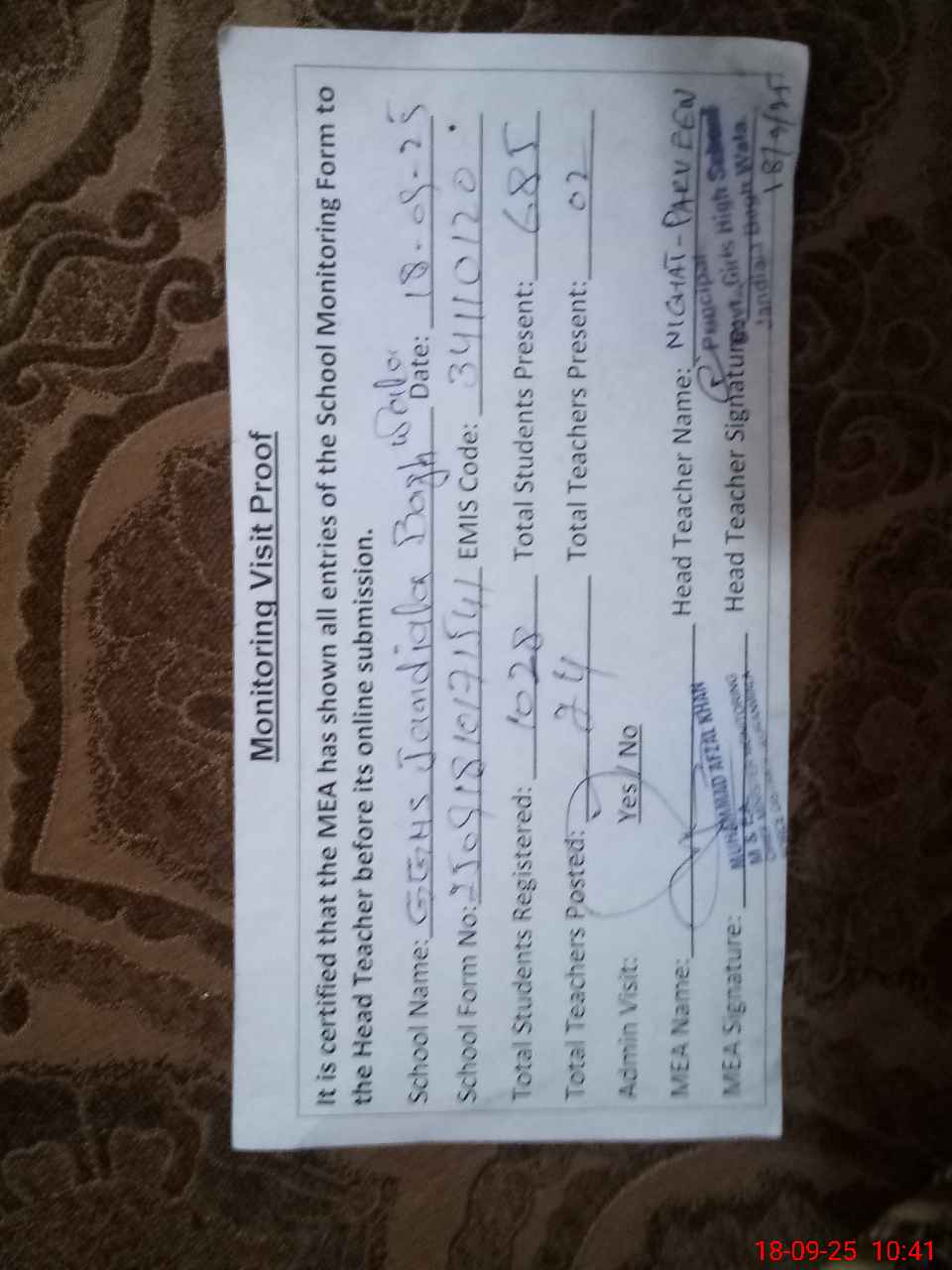 | Attendance Register | Head Teacher | MEA with School | Visit Proof |