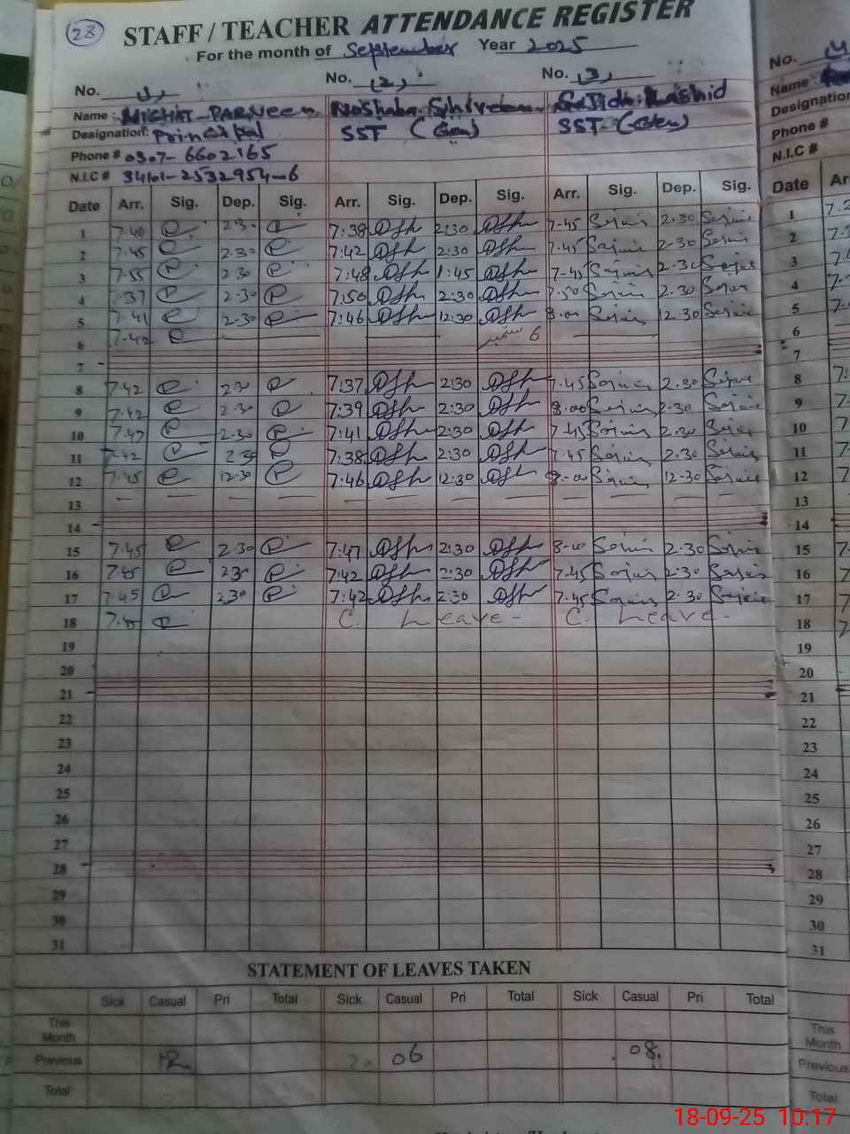 | CNIC | Full Name | Designation | R/C | Absence during last cal. month |