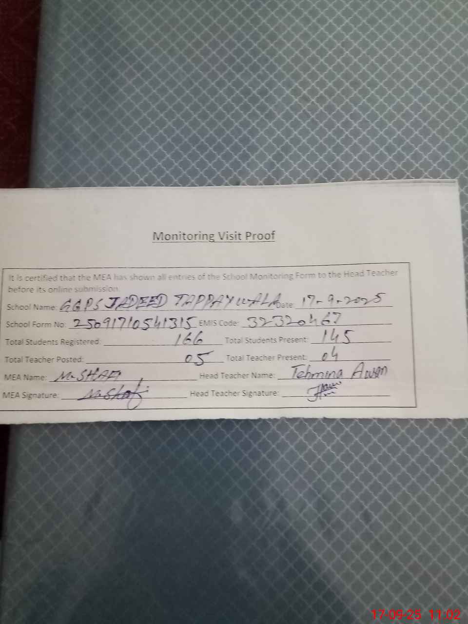| EMIS Code: 32320467 | Name of School: GGPS JADEED TAPPAY WALA | |||