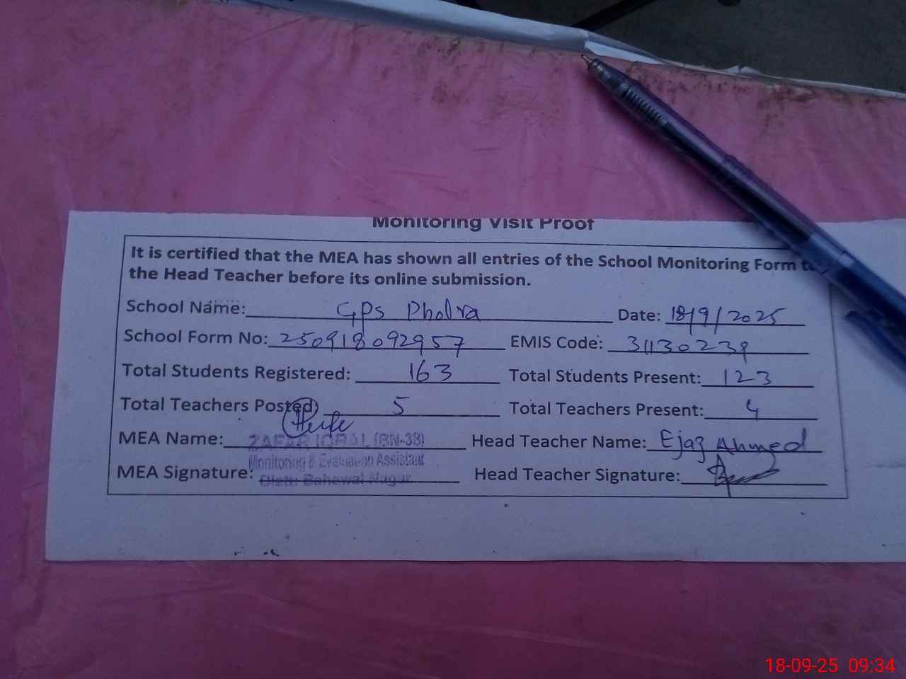 | Attendance Register | Head Teacher | MEA with School | Visit Proof |