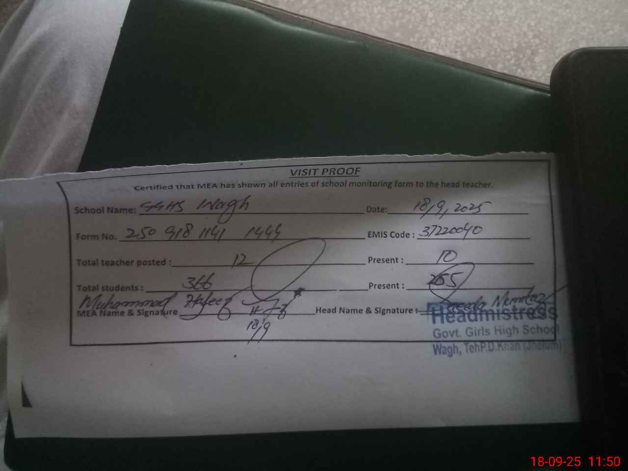 | Attendance Register | Head Teacher | MEA with School | Visit Proof |