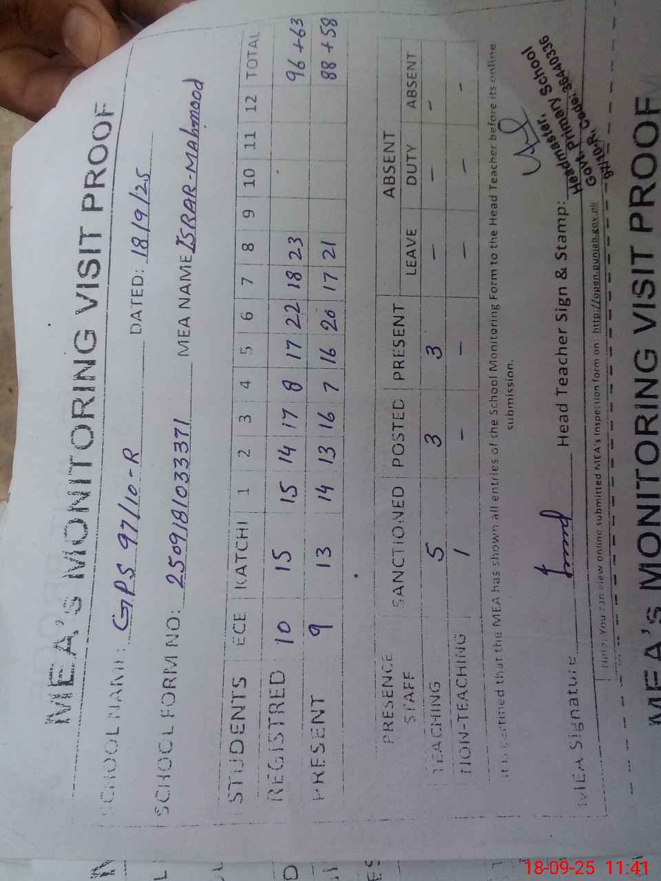 | Attendance Register | Head Teacher | MEA with School | Visit Proof |