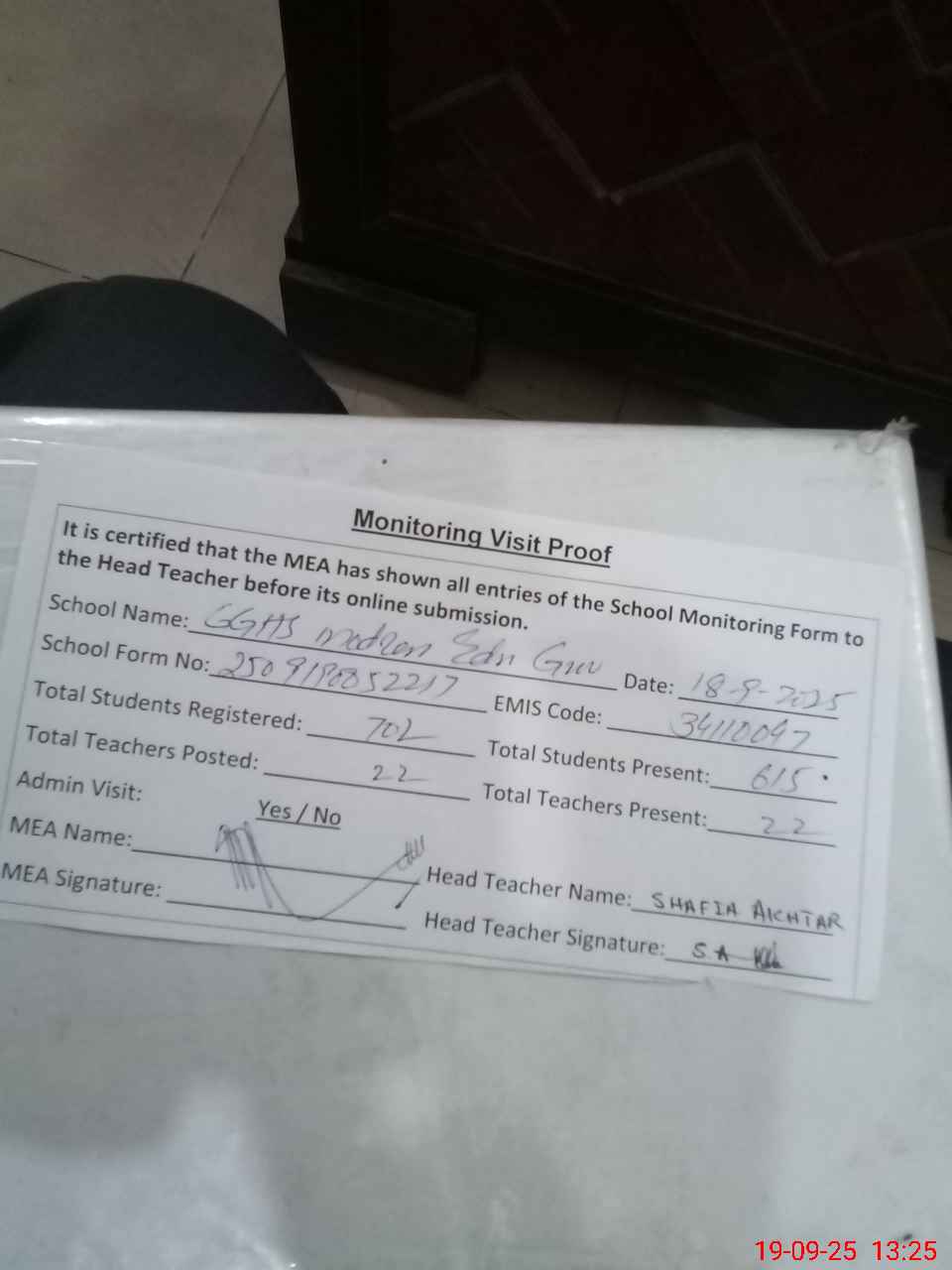 | Attendance Register | Head Teacher | MEA with School | Visit Proof |