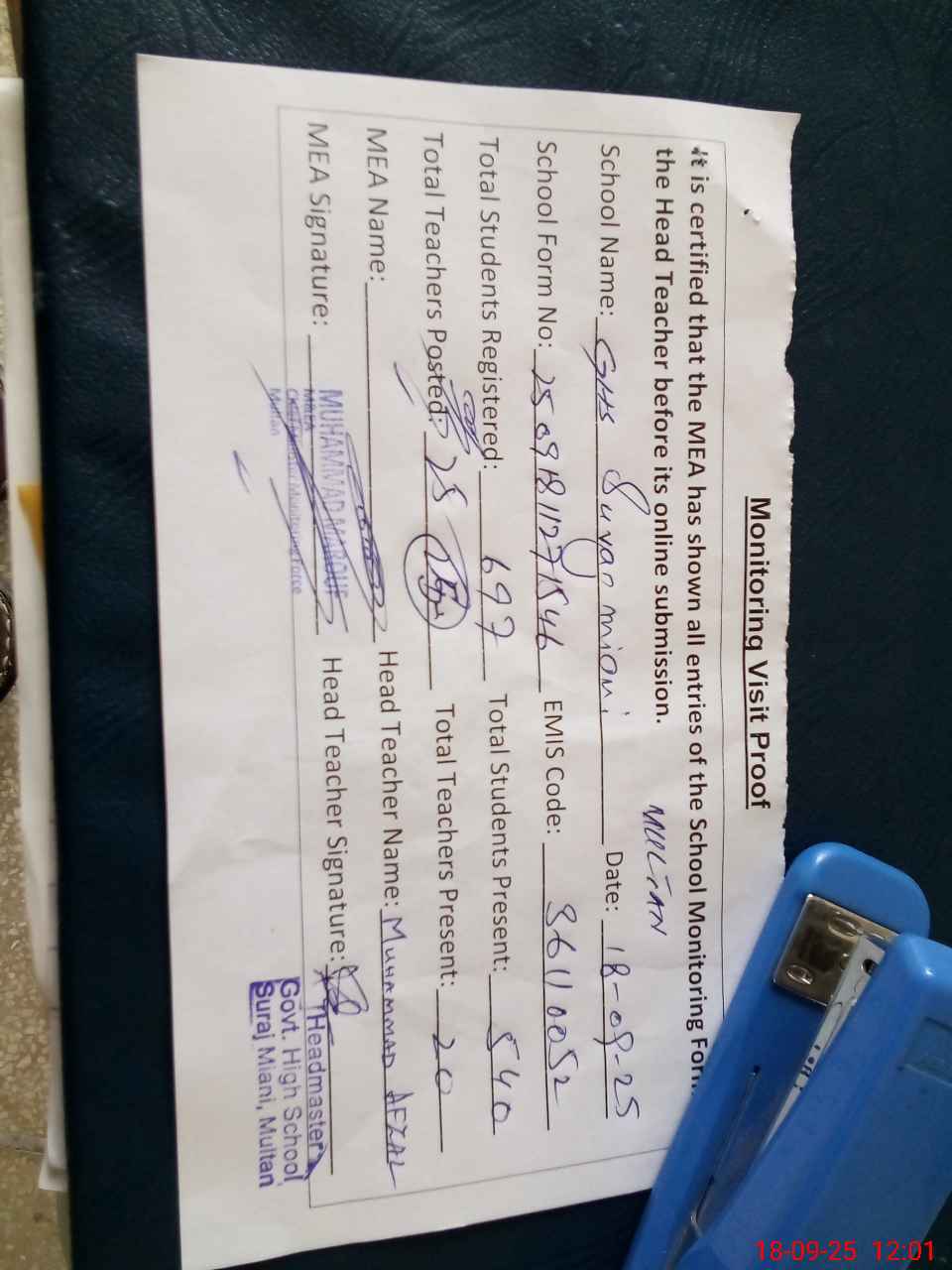 | Attendance Register | Head Teacher | MEA with School | Visit Proof |