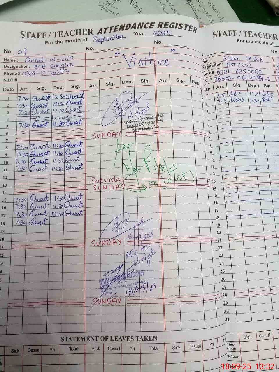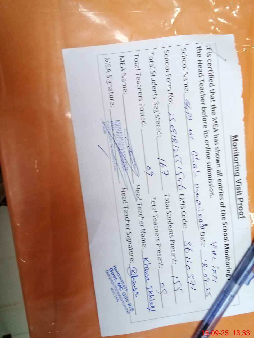 | Attendance Register | Head Teacher | MEA with School | Visit Proof |