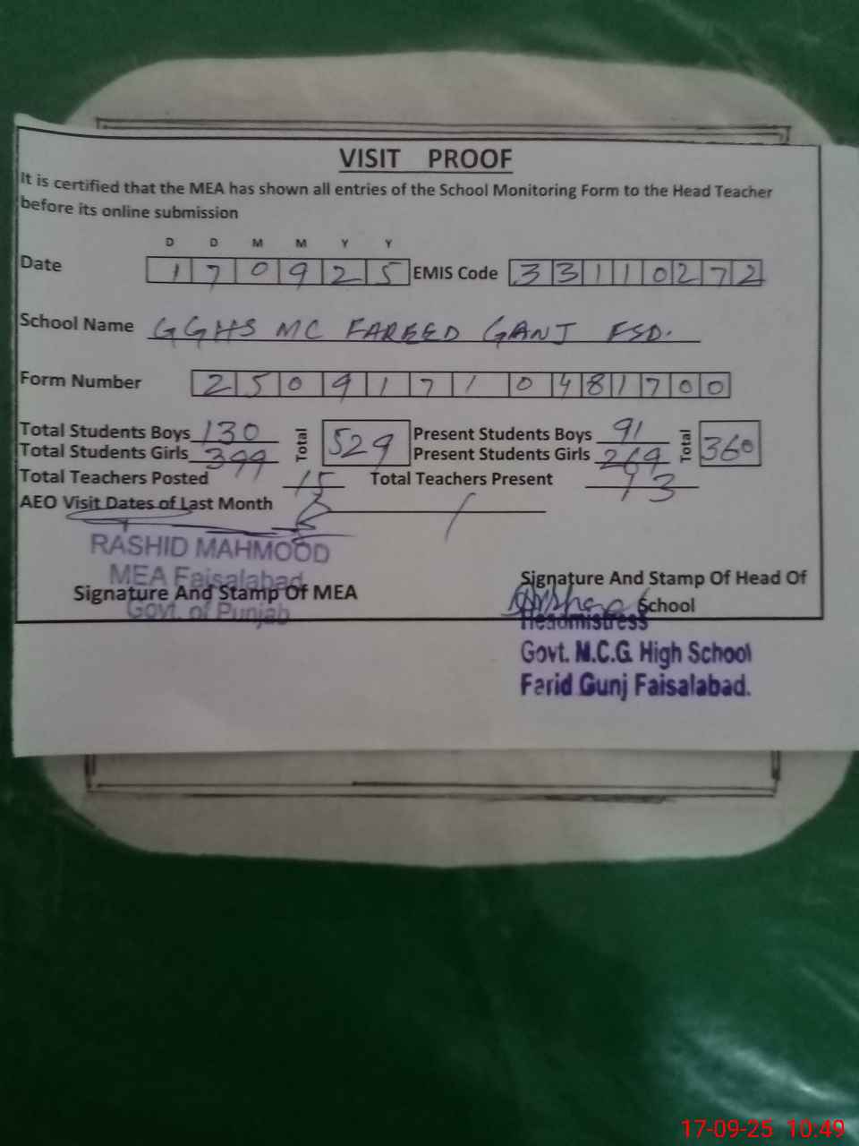 | EMIS Code: 33110272 | Name of School: GGHS MC FARID GUNJ | |||