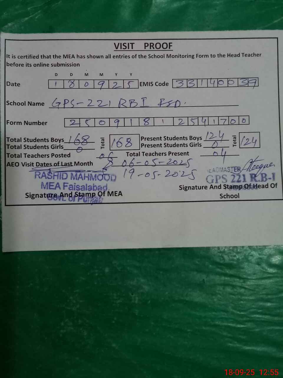 | Attendance Register | Head Teacher | MEA with School | Visit Proof |