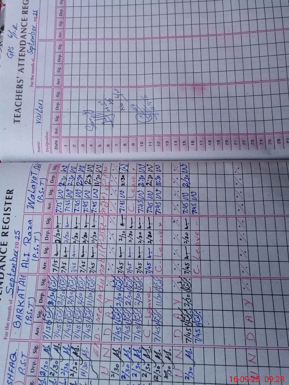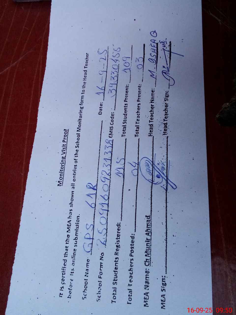 | Attendance Register | Head Teacher | MEA with School | Visit Proof |