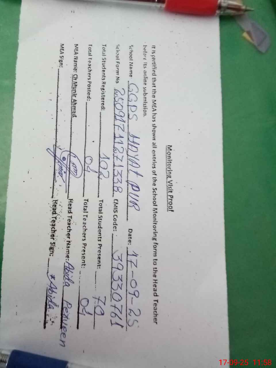 | EMIS Code: 39330761 | Name of School: GGPS HAYAT PUR | |||
