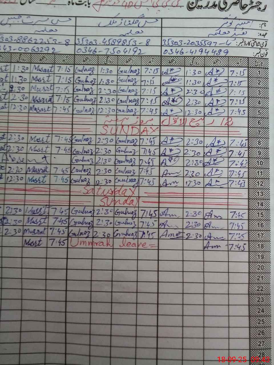 | CNIC | Full Name | Designation | R/C | Absence During Last Calender Month |