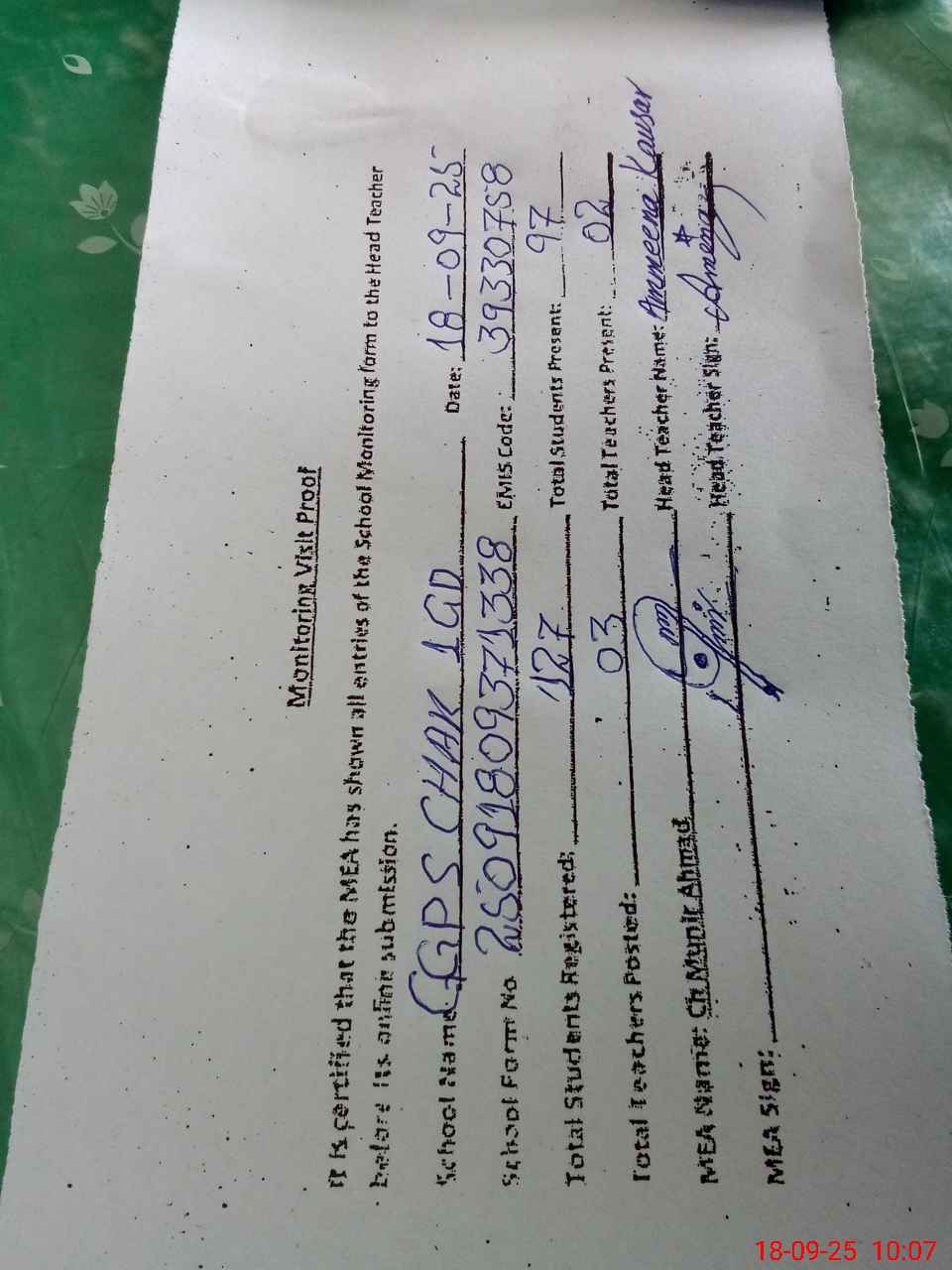 | Attendance Register | Head Teacher | MEA with School | Visit Proof |