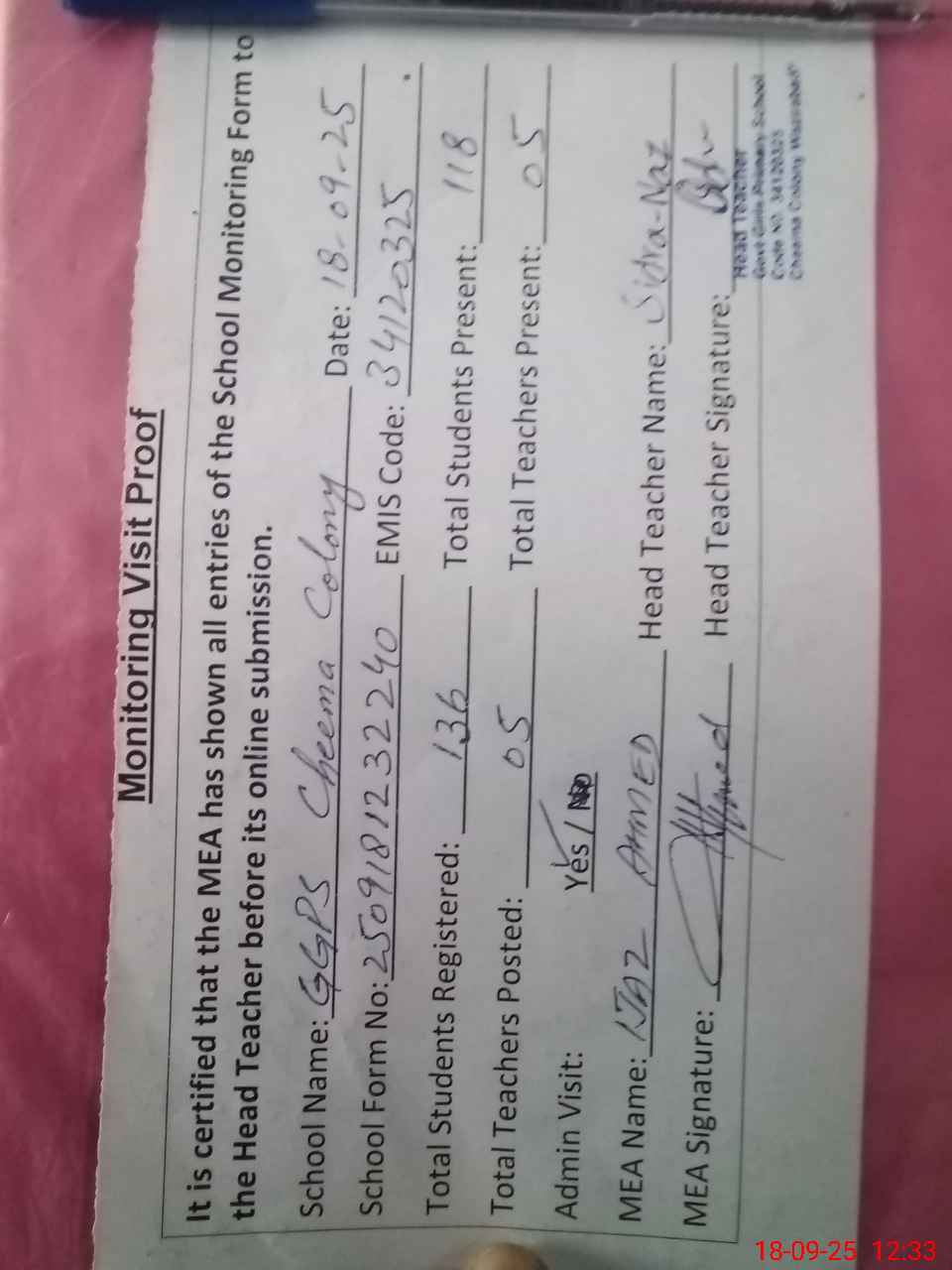 | EMIS Code: 34120325 | Name of School: GGPS CHEEMA COLONY | |||