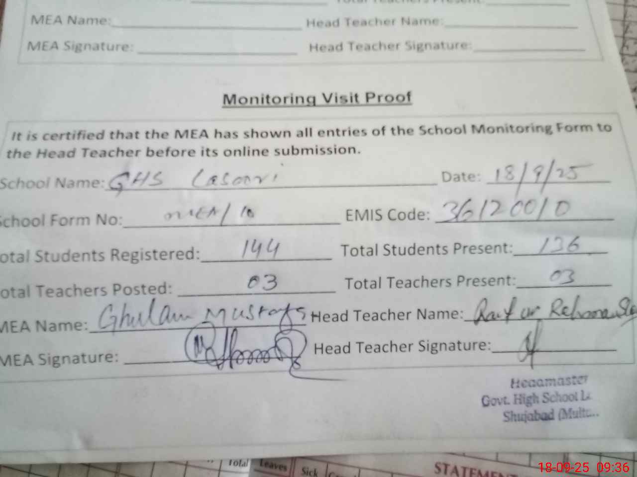 | Attendance Register | Head Teacher | MEA with School | Visit Proof |