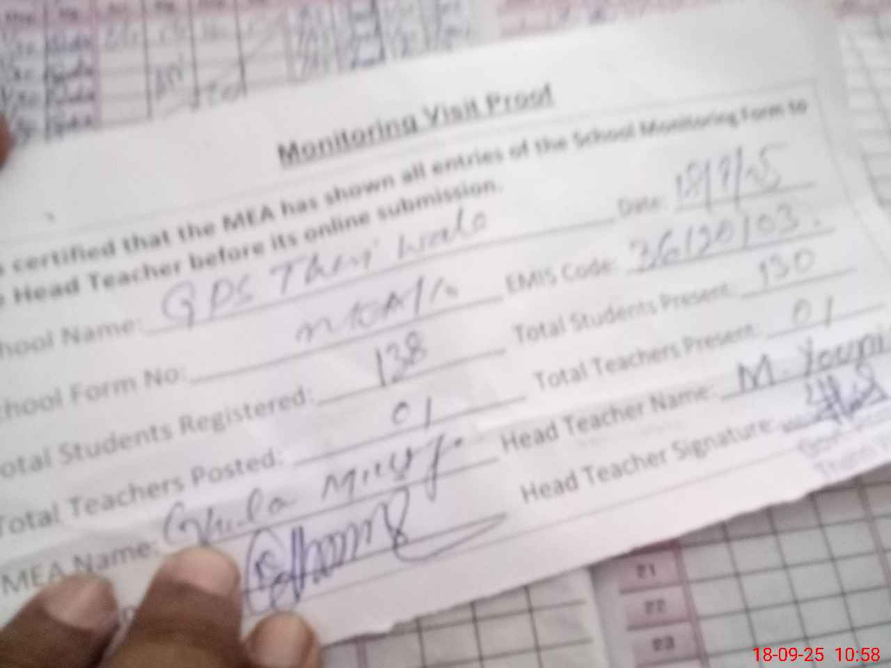 | Attendance Register | Head Teacher | MEA with School | Visit Proof |