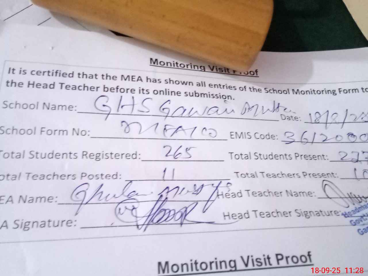 | Attendance Register | Head Teacher | MEA with School | Visit Proof |