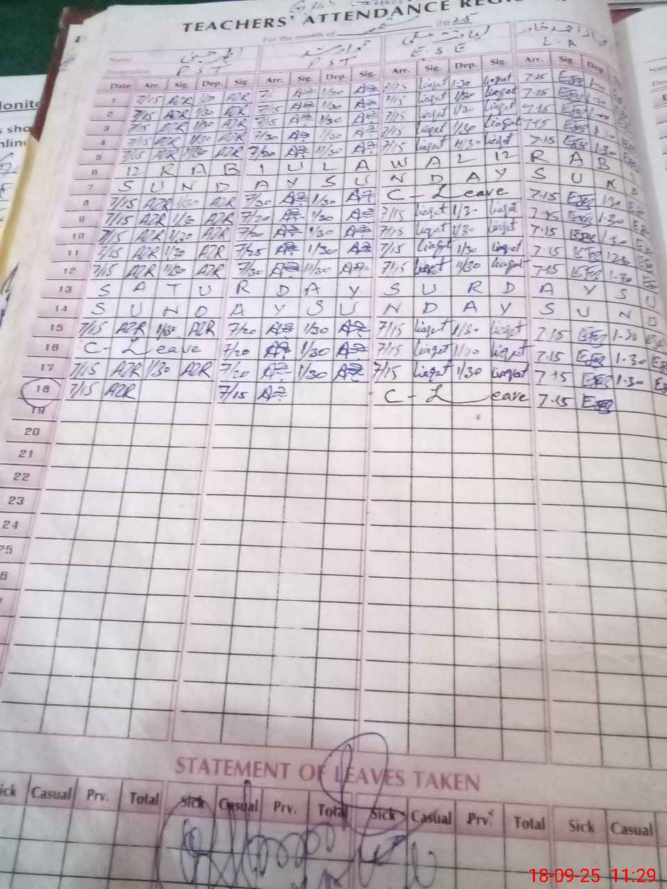 | CNIC | Full Name | Designation | R/C | Absence During Last Calender Month |