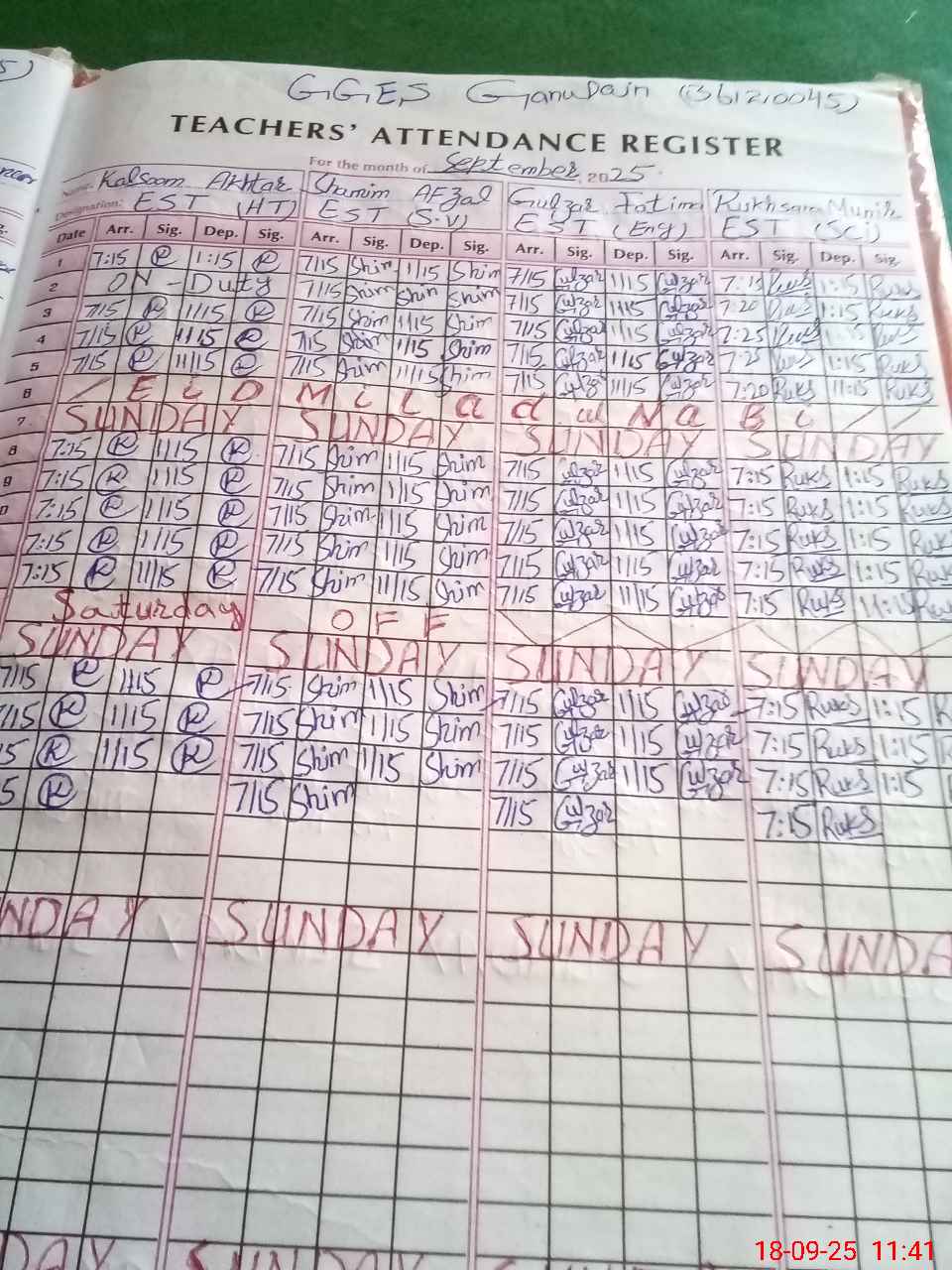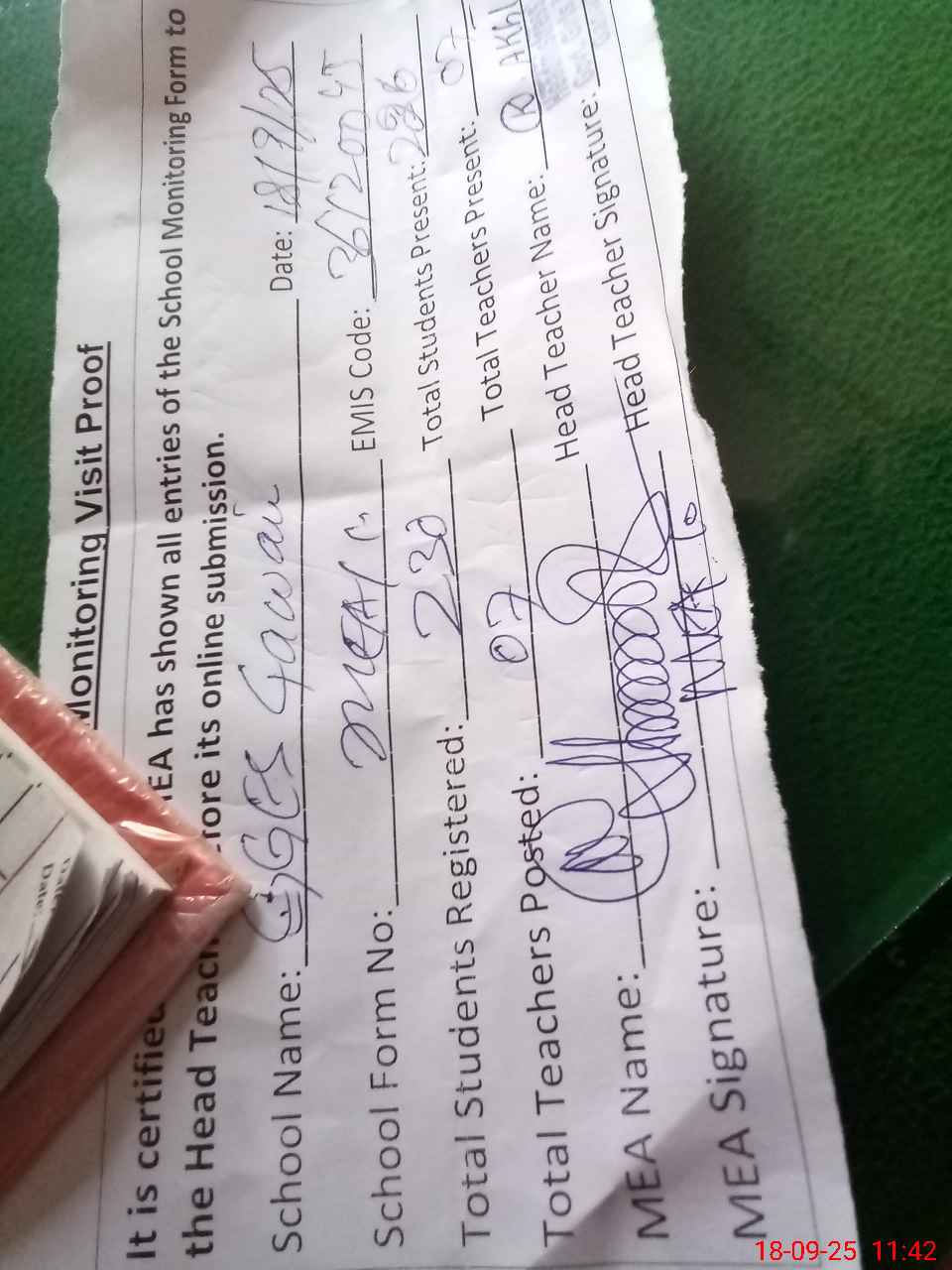 | Attendance Register | Head Teacher | MEA with School | Visit Proof |