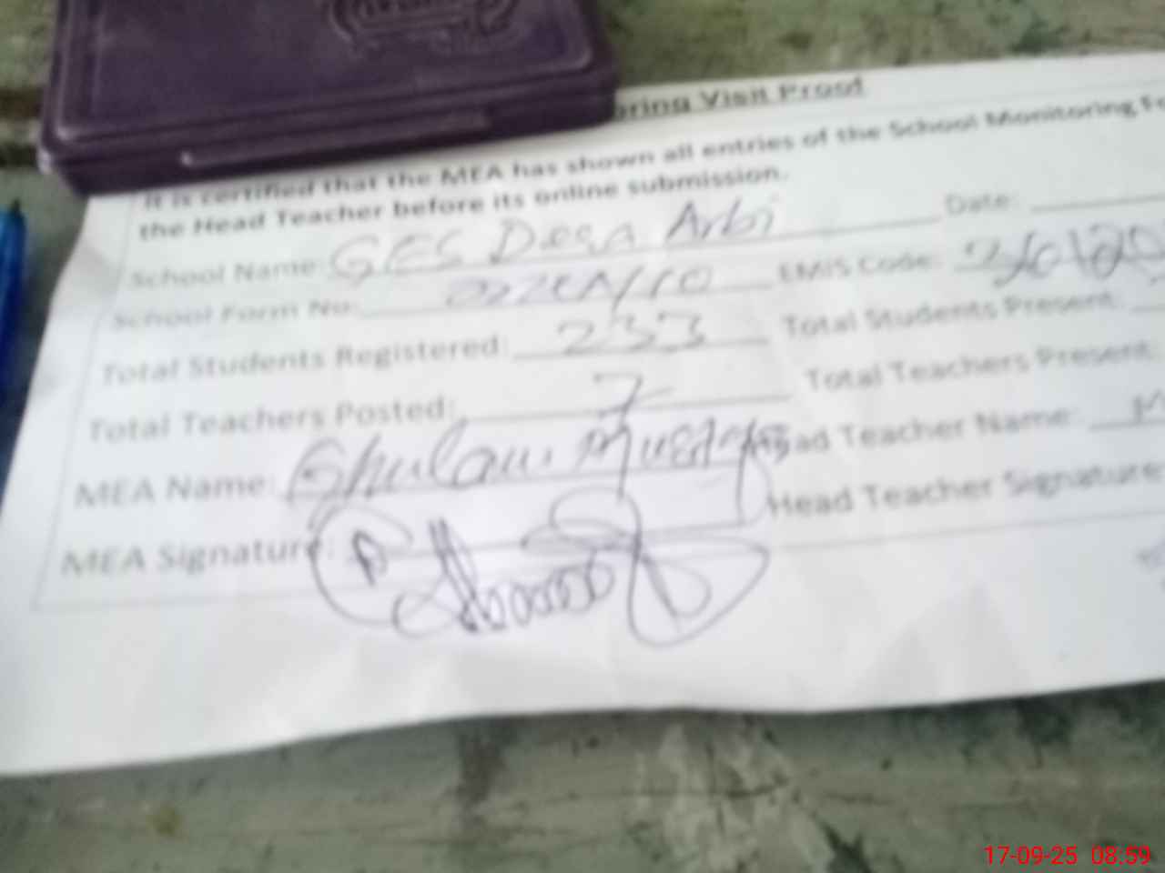 | Attendance Register | Head Teacher | MEA with School | Visit Proof |