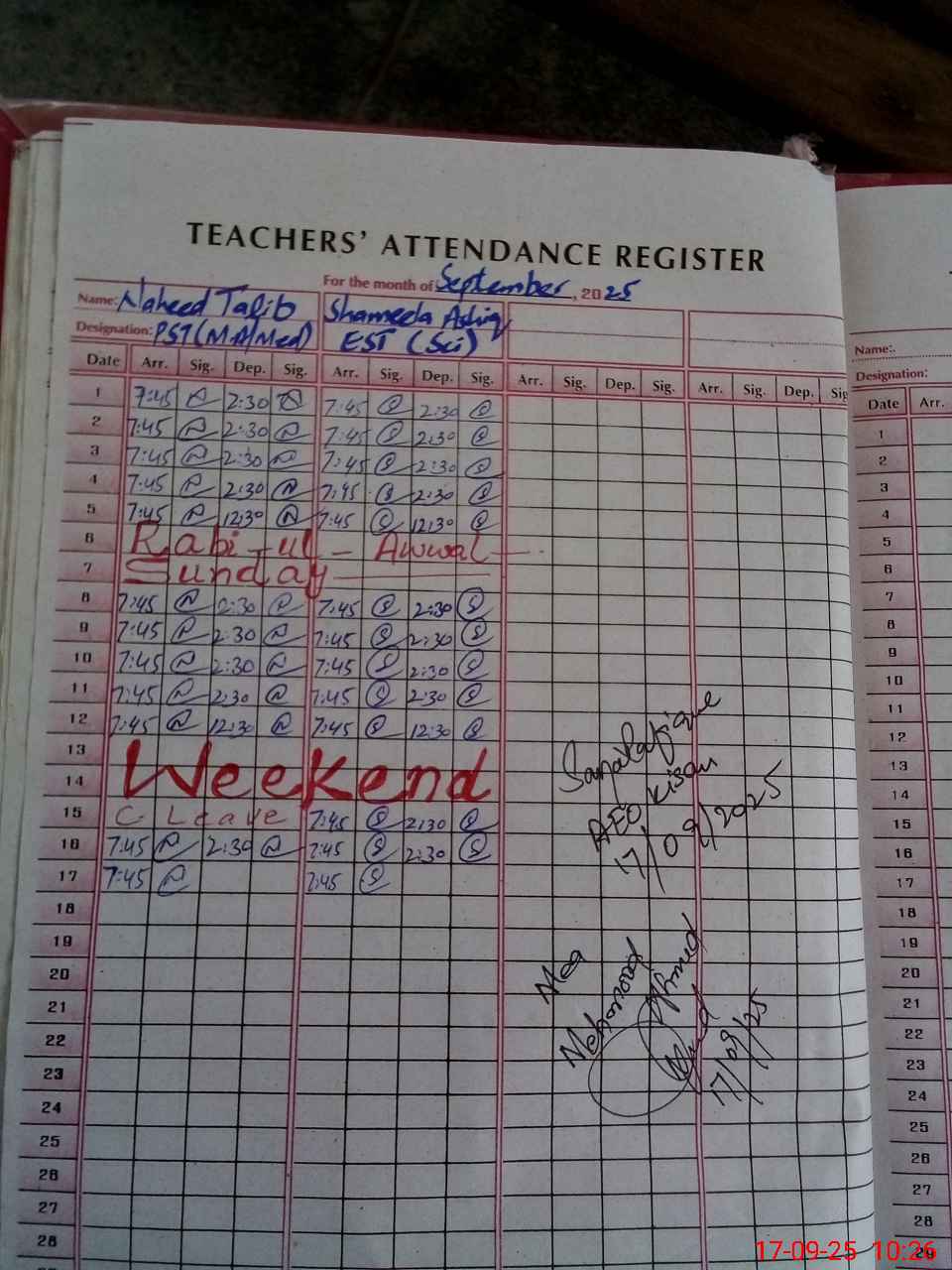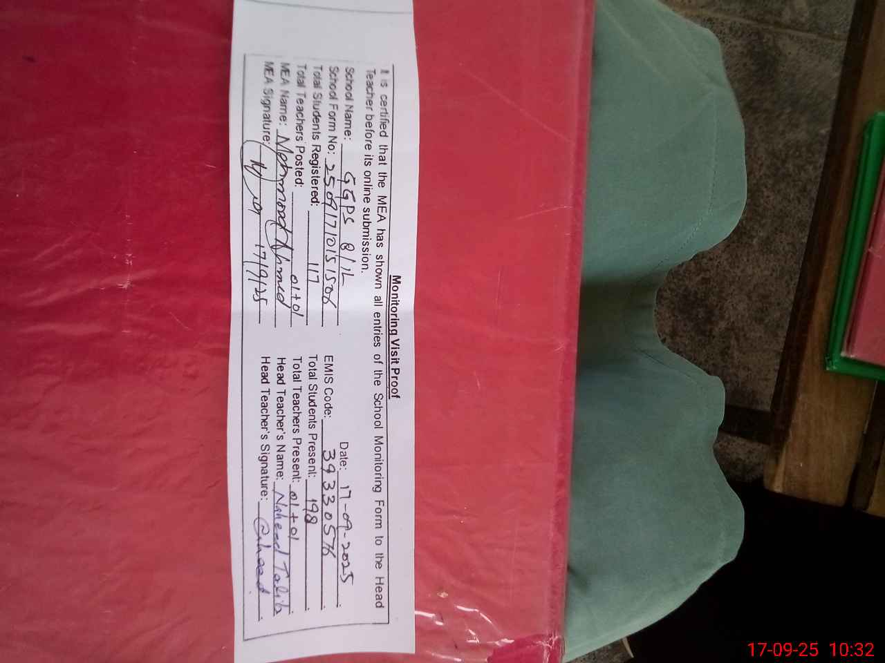 | Attendance Register | Head Teacher | MEA with School | Visit Proof |