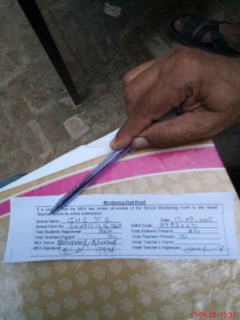 | Name: Gh**** Ra**** Designation: (School Headmaster's/Headmistress's) SST INCHARGE HM Phone/Cell Number: 03**** |