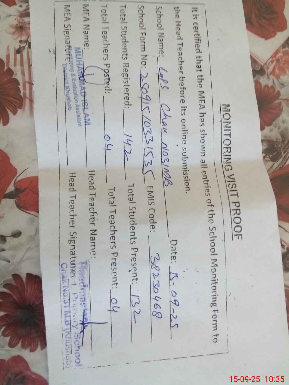 | Attendance Register | Head Teacher | MEA with School | Visit Proof |