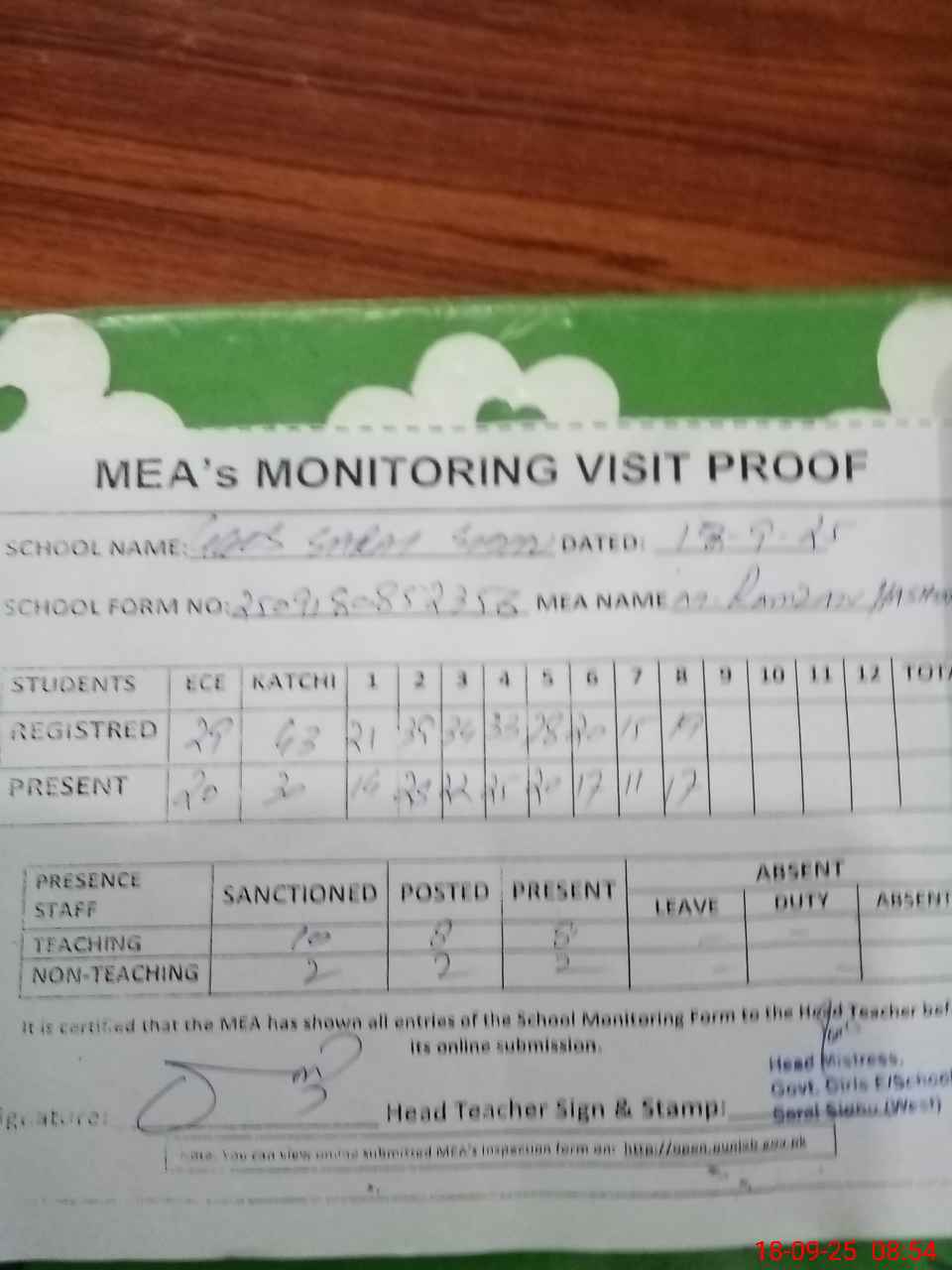| Attendance Register | Head Teacher | MEA with School | Visit Proof |