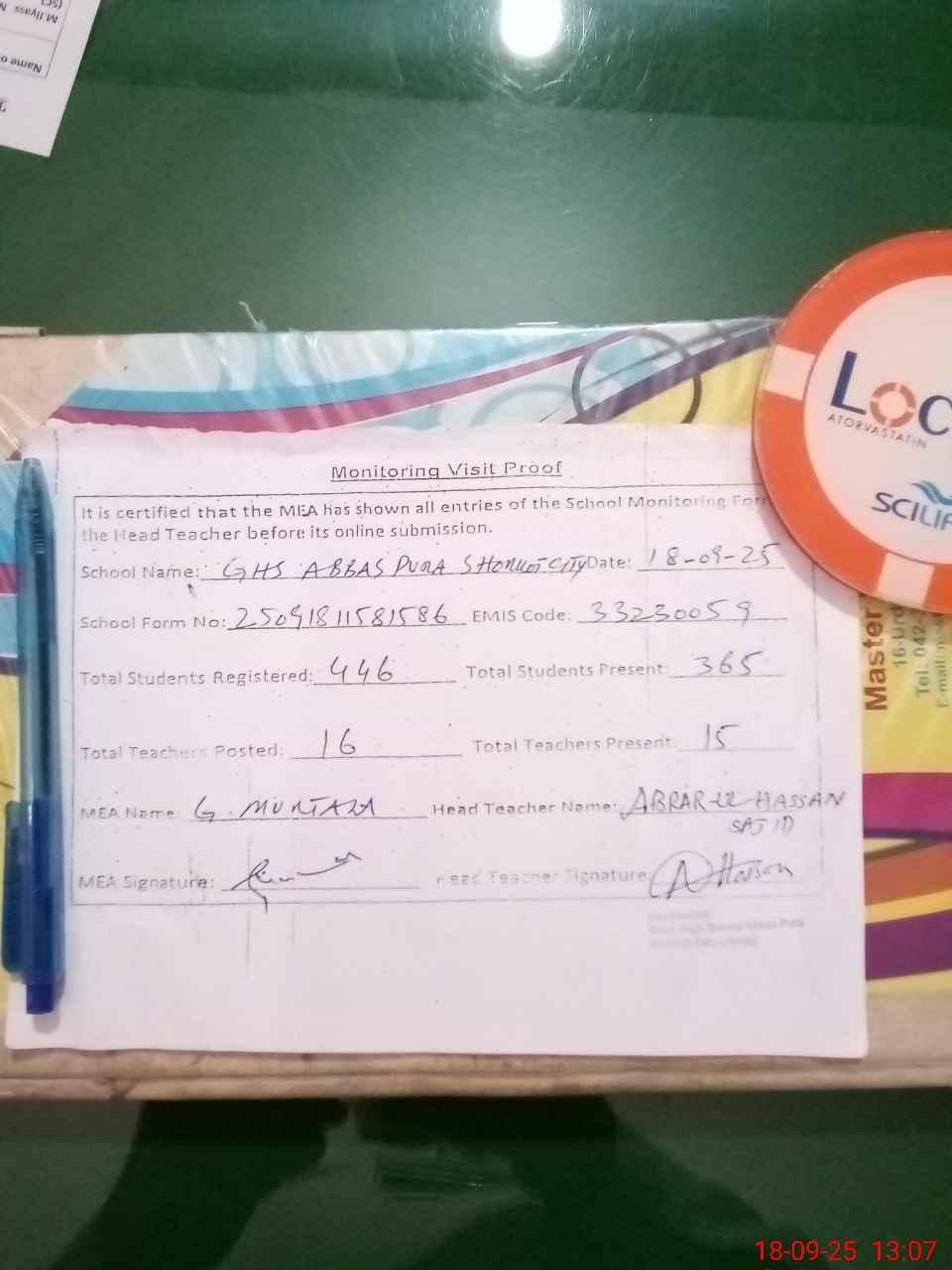 | Attendance Register | Head Teacher | MEA with School | Visit Proof |