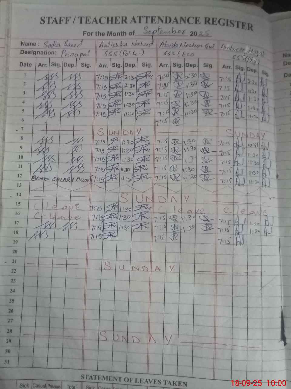 | CNIC | Full Name | Designation | R/C | Absence During Last Calender Month |