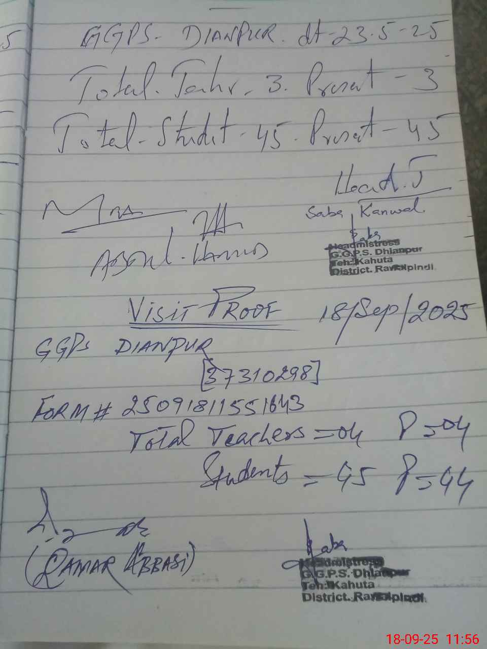 | Attendance Register | Head Teacher | MEA with School | Visit Proof |