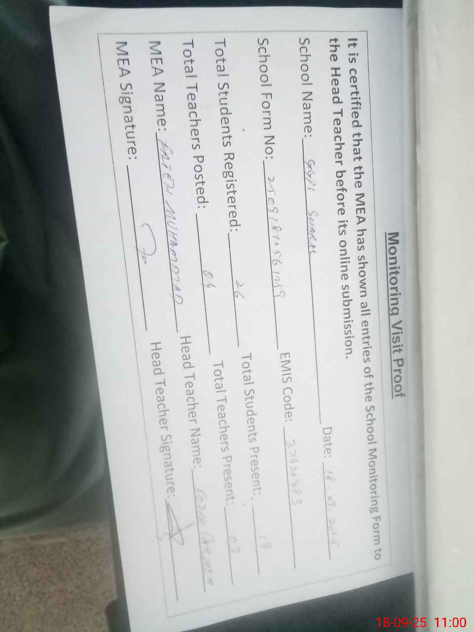 | Attendance Register | Head Teacher | MEA with School | Visit Proof |