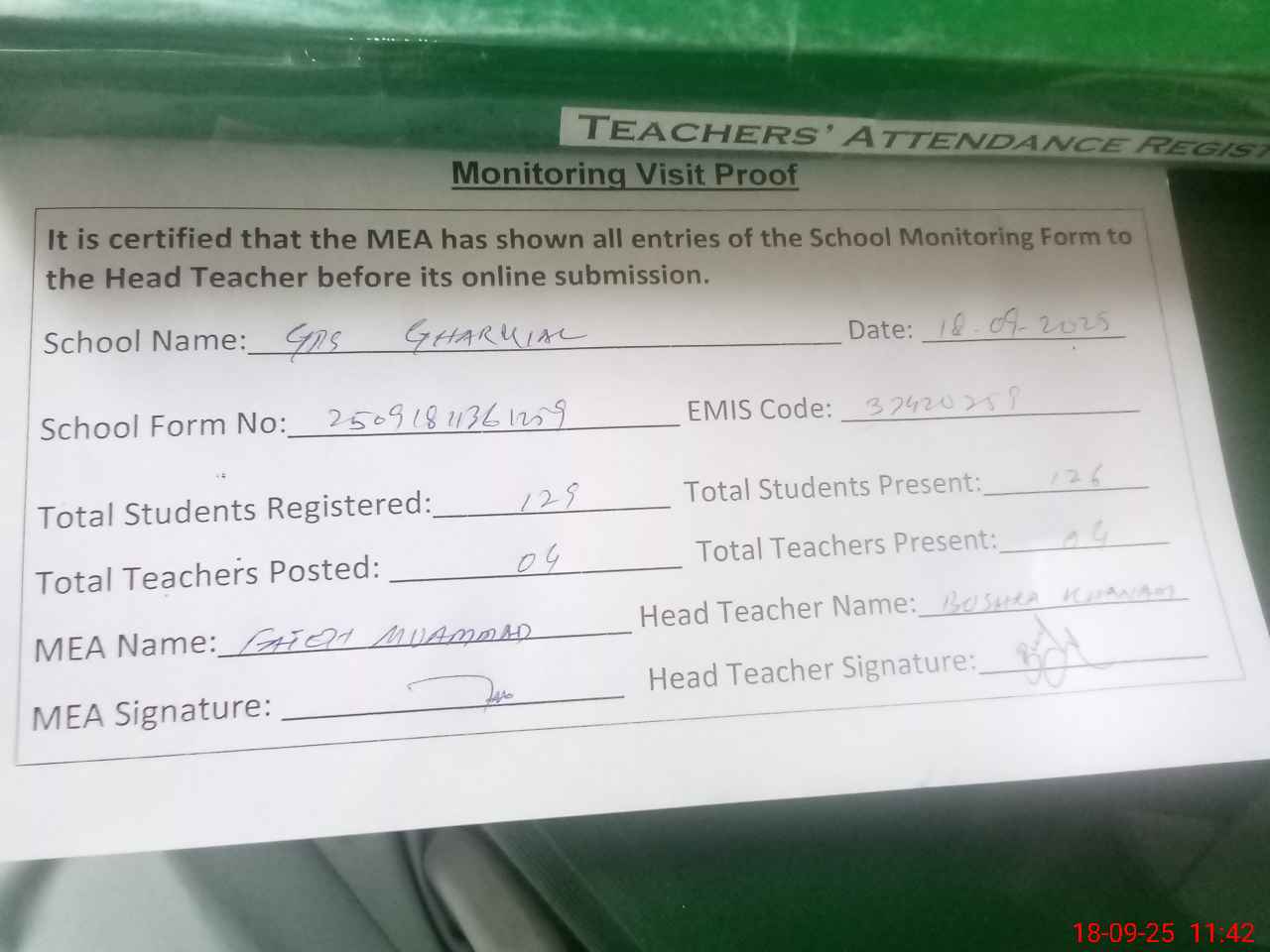 | Attendance Register | Head Teacher | MEA with School | Visit Proof |