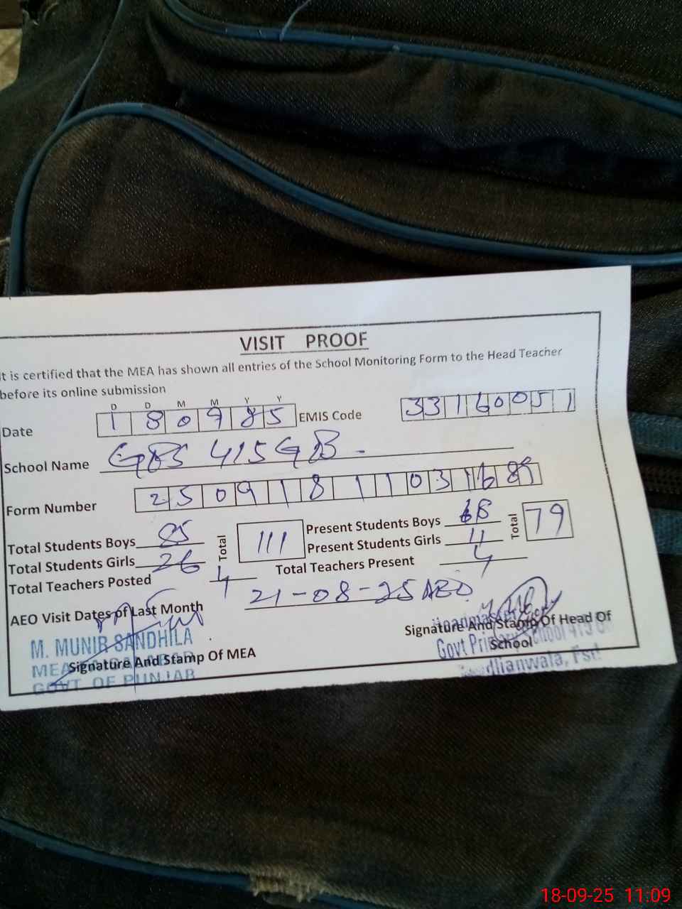 | EMIS Code: 33160051 | Name of School: GPS CHAK 415 GB TANDLIANWALA | |||