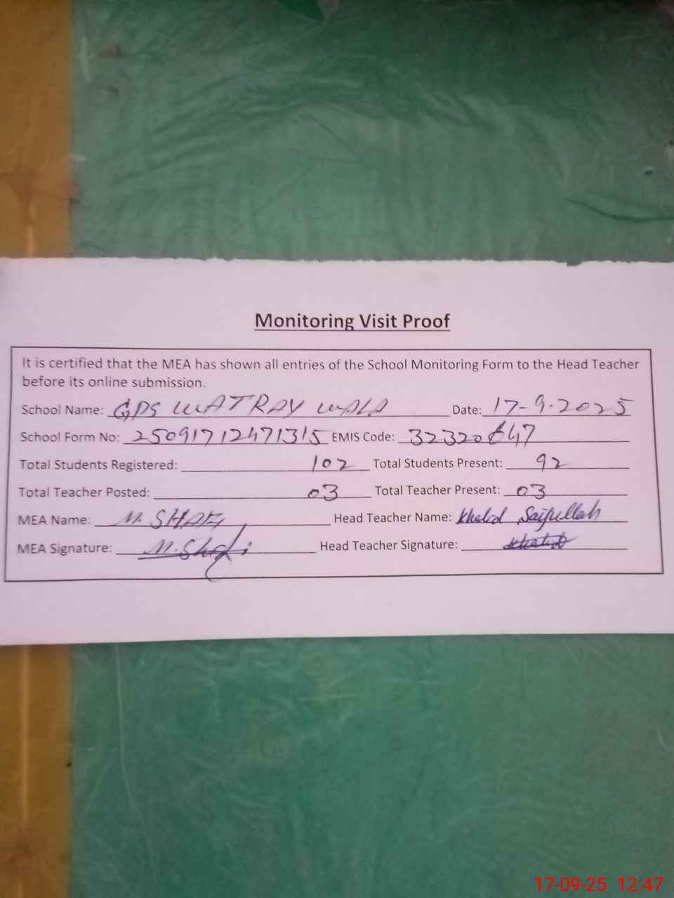 | Attendance Register | Head Teacher | MEA with School | Visit Proof |