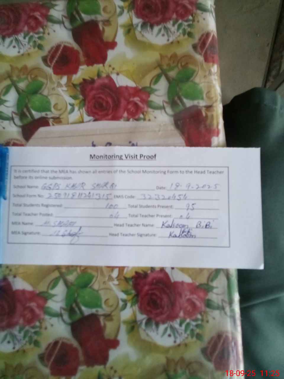 | Attendance Register | Head Teacher | MEA with School | Visit Proof |