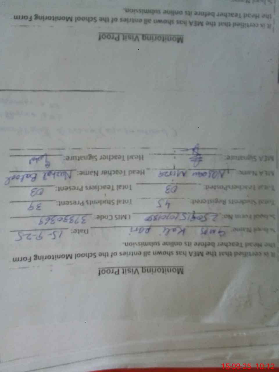 | Certified that this School was Inspected by the Undersigned MEA/DMO Today and the Information Stated Above is as Per Record. | |||||