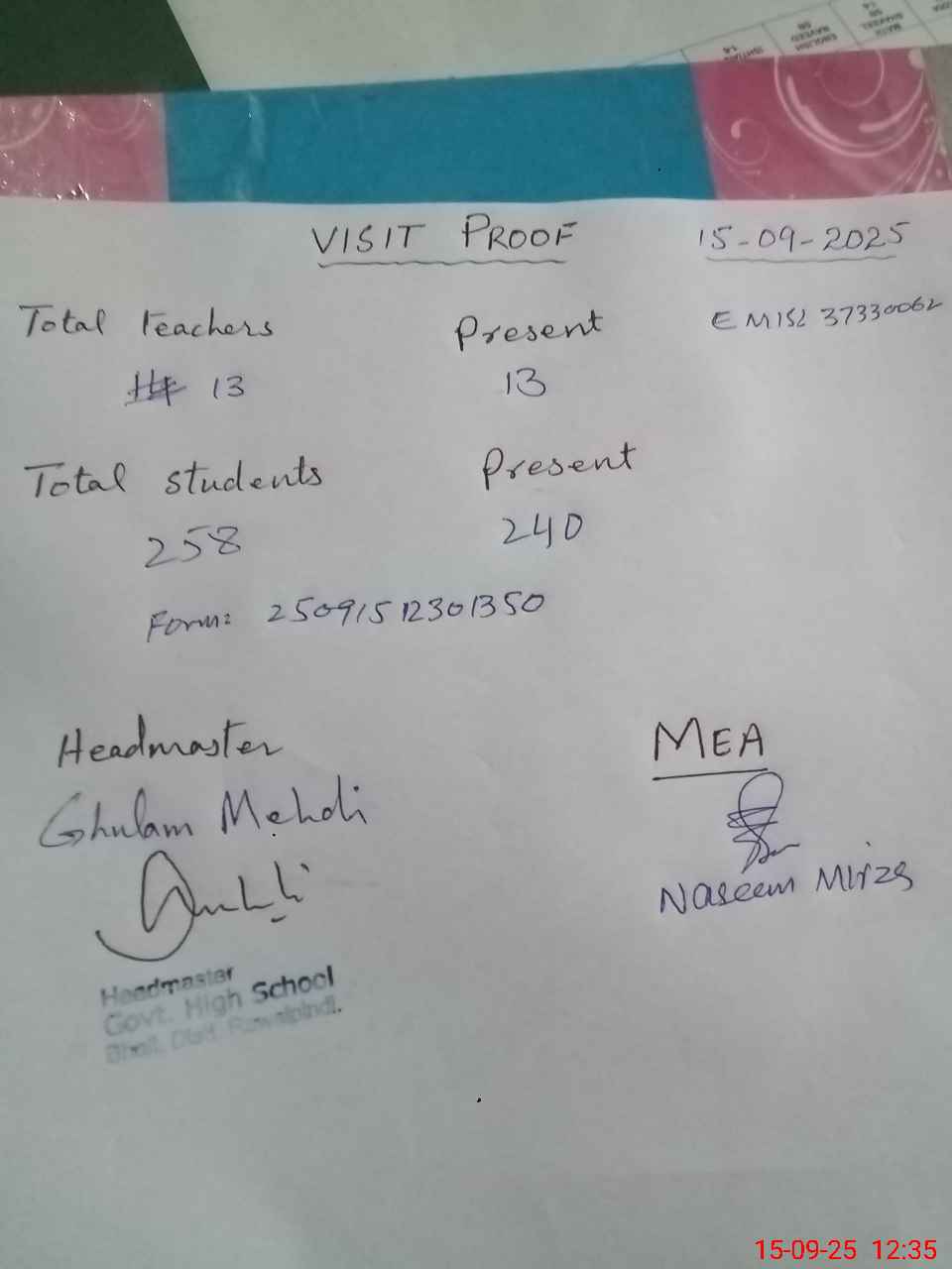 | Attendance Register | Head Teacher | MEA with School | Visit Proof |