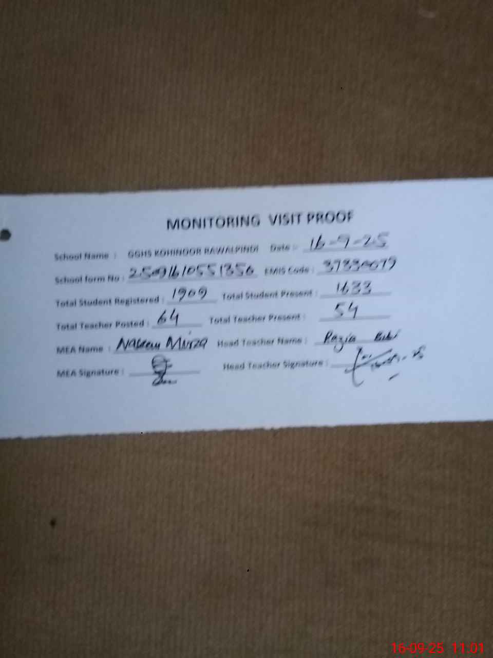 | Attendance Register | Head Teacher | MEA with School | Visit Proof |