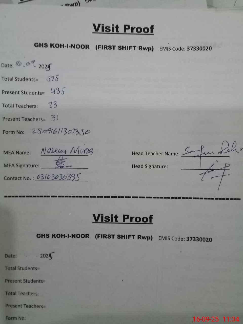 | Attendance Register | Head Teacher | MEA with School | Visit Proof |