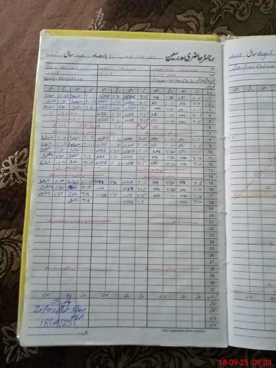| Monitoring Date: 18-09-2025 | Start Time: 18-09-2025 08:30 AM | End Time: 18-09-2025 09:07 AM | Name of MEA: ZA**** UL**** KH**** | |