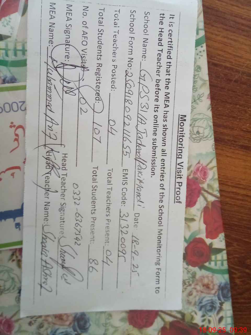 | Attendance Register | Head Teacher | MEA with School | Visit Proof |