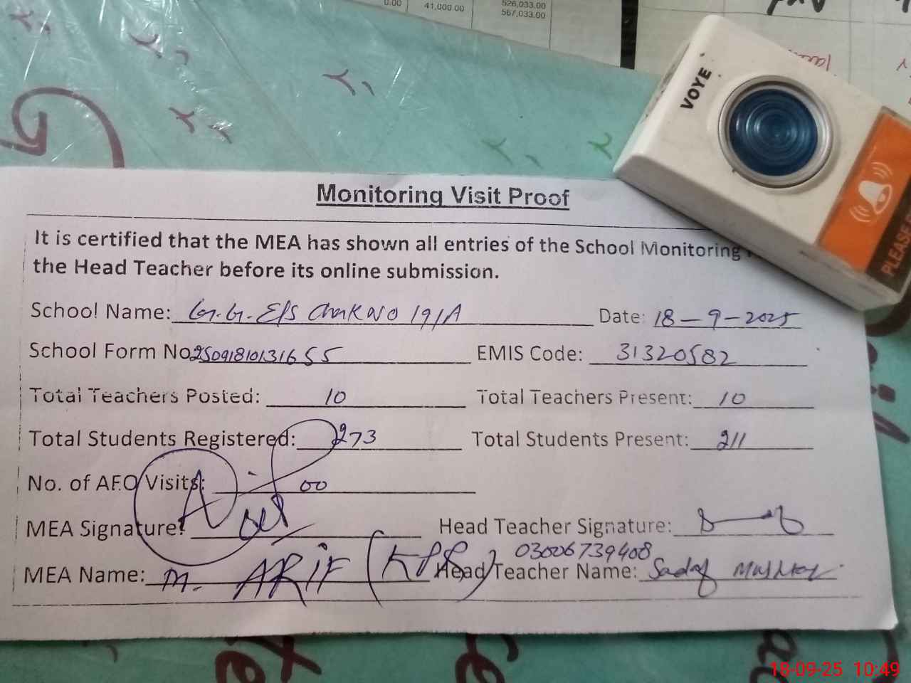 | Attendance Register | Head Teacher | MEA with School | Visit Proof |