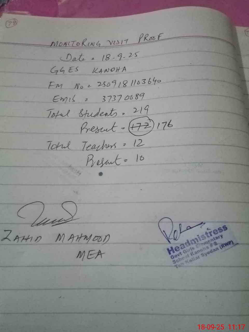 | Attendance Register | Head Teacher | MEA with School | Visit Proof |